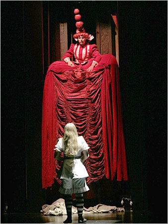 One of Chicago's beloved productions opens this week for yet another run. Lookingglass Alice, Lookingglass Theatre's original and signature piece, returns from tours to play the performance space at the Water Tower. Make it's third appearance in this show is a 30 foot long white scarf knitted especially for the production.Alice when first arriving in Wonderland is greeted by a immensely sized White Queen knitting a very long garment which will appear later as a baby blanket for the character grows younger, not older. The piece was commissioned for the production by Props Designer Joe Schneider and created by Mary Cotter in 2007. The craftsmanship was so good that the prop continues to be used in the production. The piece employs over $80 worth of yarn and took nearly a month to construct.